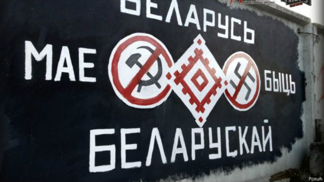 На одном из рисунков в обведенных красным окружностях (похоже на форму запрещающего автомобильного знака) – перечеркнутые свастика и серп с молотом. Надпись гласит: «Беларусь мае быць беларускай».